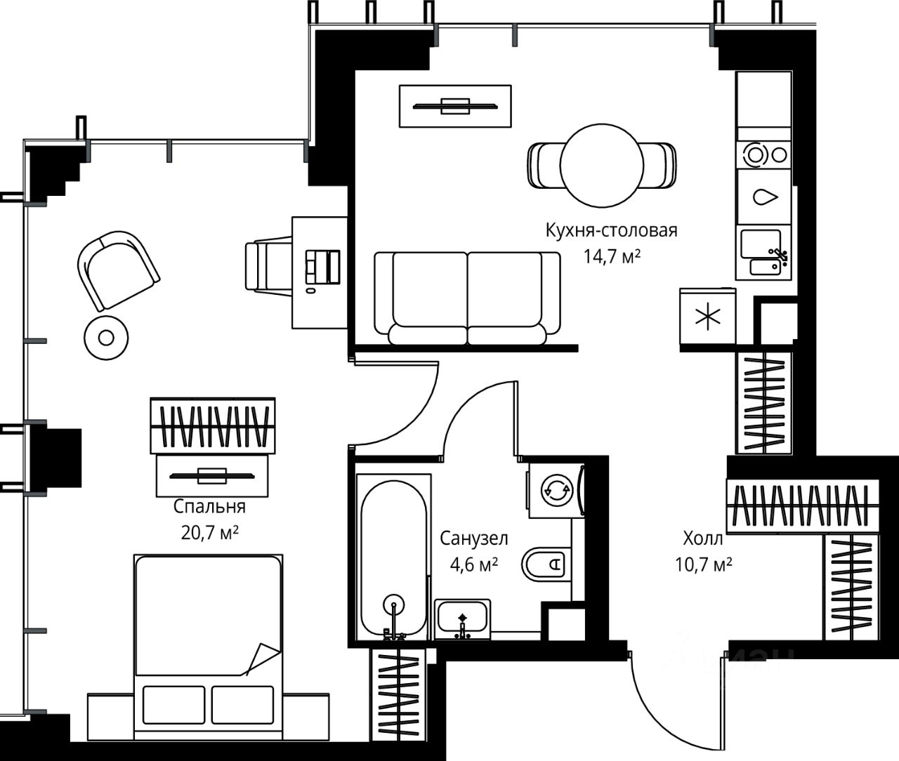 Продаётся 1-комнатная квартира общей площадью 50.70 м² без отделки в ЖК Веер на 55-м этаже 59 этажного дома.