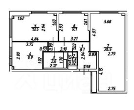 Функциональная планировка: просторная кухня-гостиная, три изолированные комнаты, два санузла, небольшая кладовка, потолки 2,65 м.