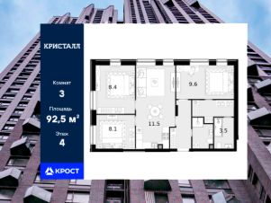 Трёхкомнатная квартира площадью 92,5 кв.м. на 4 этаже дома бизнес-класса "Трилогия Кристалл".