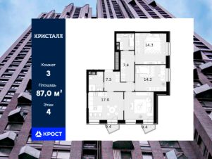 Трёхкомнатная квартира площадью 87 кв.м. на 4 этаже дома бизнес-класса "Трилогия Кристалл".