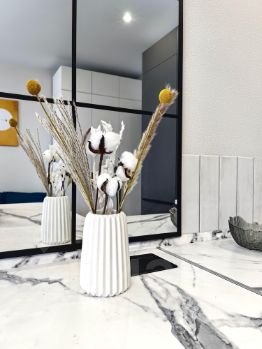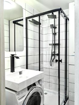 Полностью мебелирована и оборудована необходимой новой и современной техникой (посудомоечная посуда, встроенный и тихий холодильник с инверторным двигателем, стиральная машина с сушкой). Максимально возможное количество мест для хранения. Кровать на 140 см с подъемным механизмом и раскладывающийся диван.