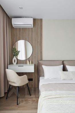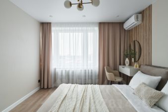 - Просторная спальня с двуспальной кроватью, кондиционером, гардеробной