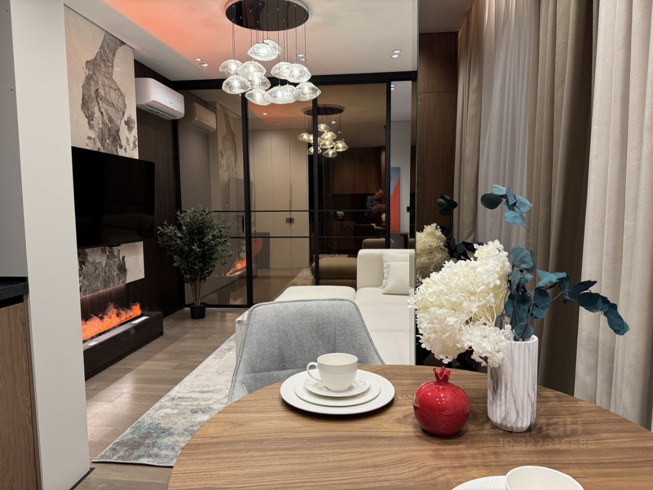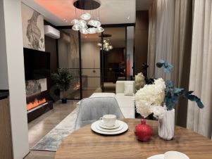 Дорогая отделка, премиальные материалы (Пол -крупноформатный керамогранит с теплыми полом и инженерная доска, потолок - гипсокартон, высокие двери шпон в потолок, вся мебель по индивид проекту, бытовая техника Bosch, камин).