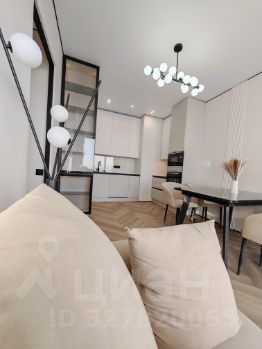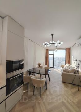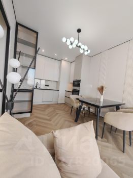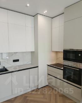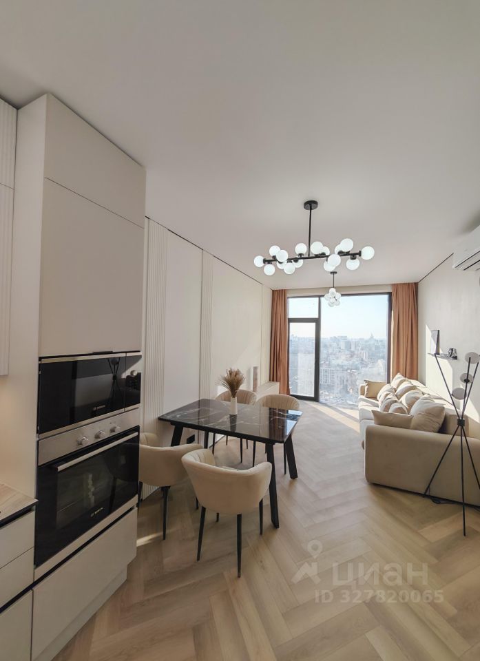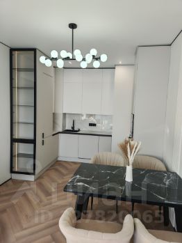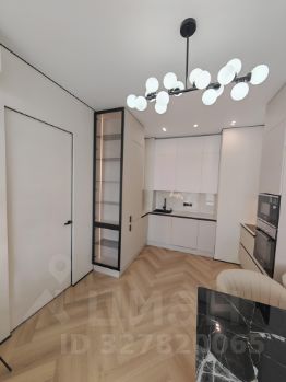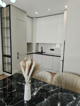 Кухня-гостиная (22 м²): Светлая зона с панорамным видом. Установлена премиальная кухня со всей встроенной техникой. Грамотное освещение: дизайнерские подвесы и встроенный точечный свет.
