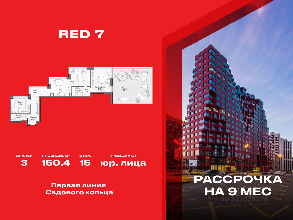 Архитектура дома: RED7 — это новая достопримечательность, дополняющая облик города. Его красный силуэт и ступенчатые террасы выделяют дом в панораме центра. Архитектурная концепция проекта разработана всемирно известным голландским бюро. Фасад RED7 — ответ русскому авангарду и сталинской архитектуре из далекого будущего. Этот дом не просто выдающееся архитектурное событие. Он задаёт тон и формирует архитектурную ДНК Москвы будущего.