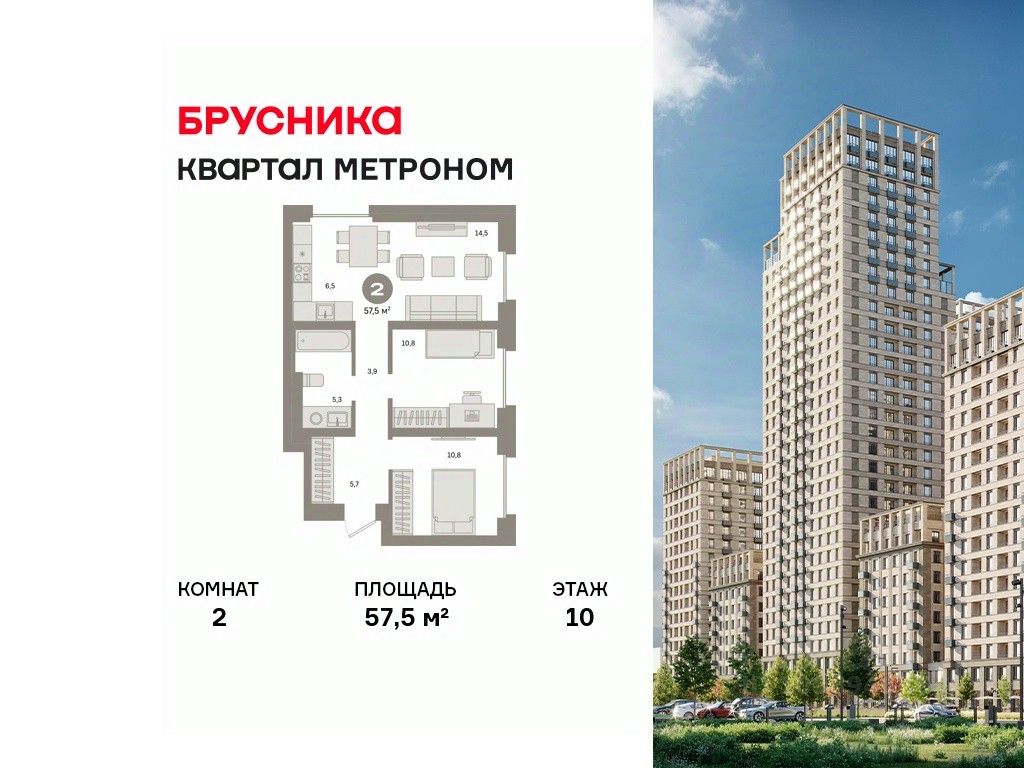 Квартира с кухней-гостиной и двумя спальнями в квартале "Метроном". Особенности планировки: вид во двор, новые лоты, предчистовая отделка.
