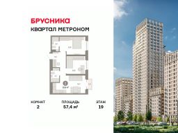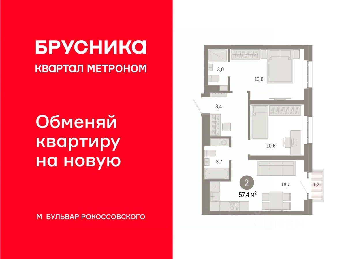 Квартира с кухней-гостиной и двумя спальнями в квартале "Метроном". Особенности планировки: балкон, мастер-спальня, новые лоты, окна в пол, предчистовая отделка.