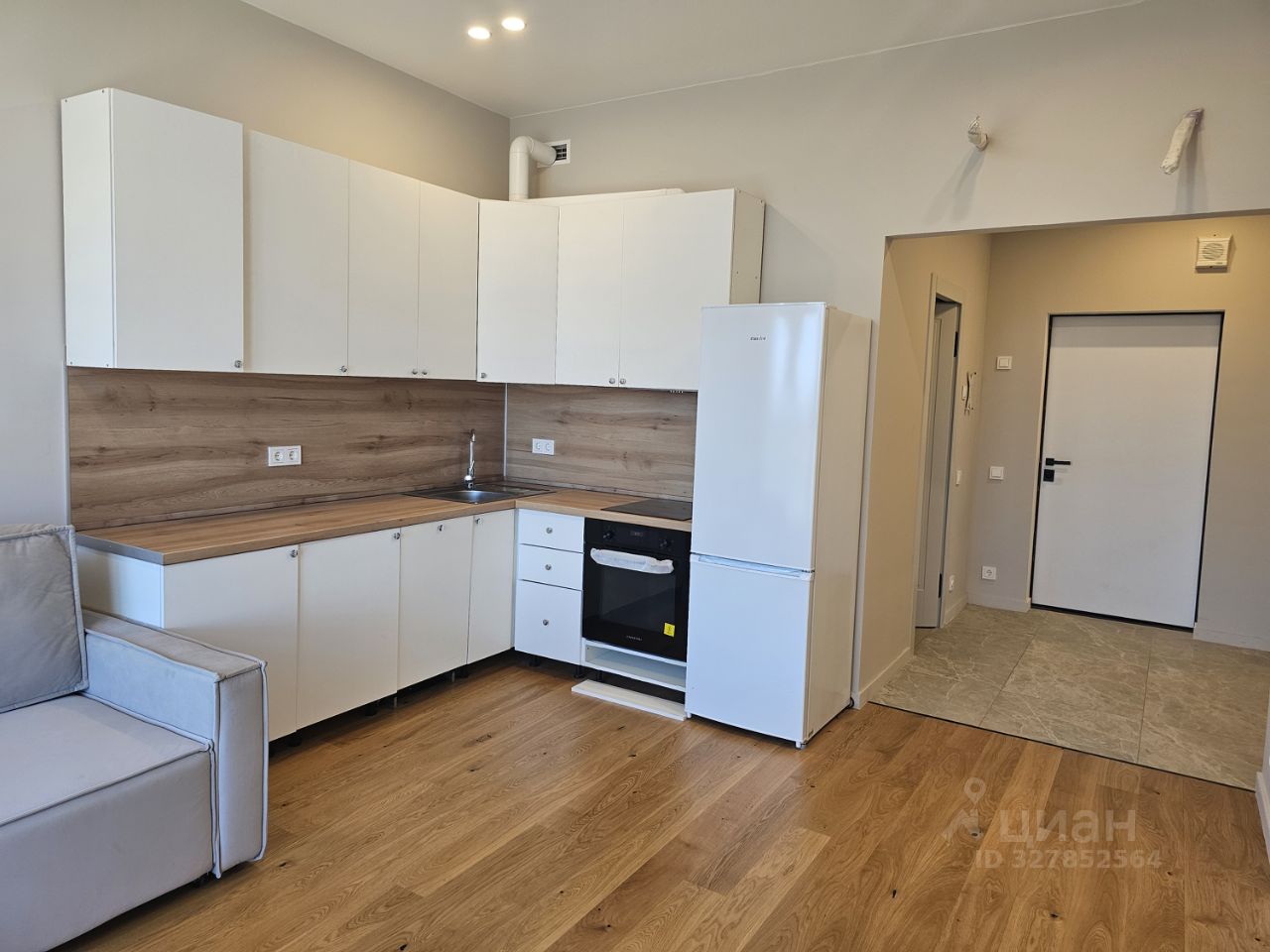 Квартира оборудована кухонным гарнитуром и укомплектована бытовой техникой. В гардеробной установлены шкафы, в спальне - новая кровать.