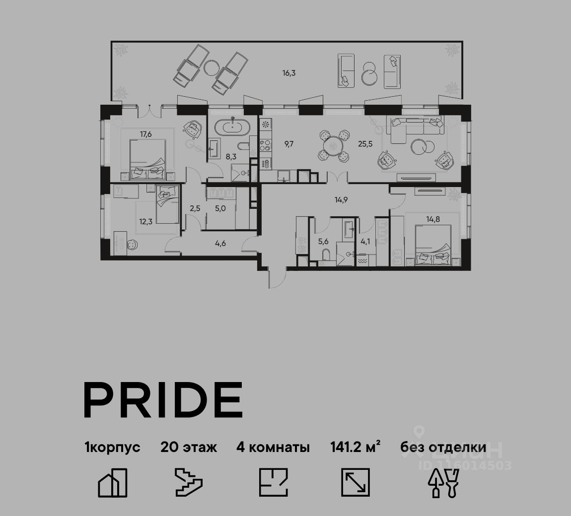 В премиальном жилом квартале PRIDE продается 4-комнатная квартира в 1 корпусе, на 20 этаже, в секции 3. Её общая площадь составляет 141.2 м². Пространство включает 3 уютные спальни 17,6 м², 12,3 м², 14,8 м², просторную кухню-гостиную 35,2 м² и ванную комнату 8,3 м². Ключи в 2026 году.