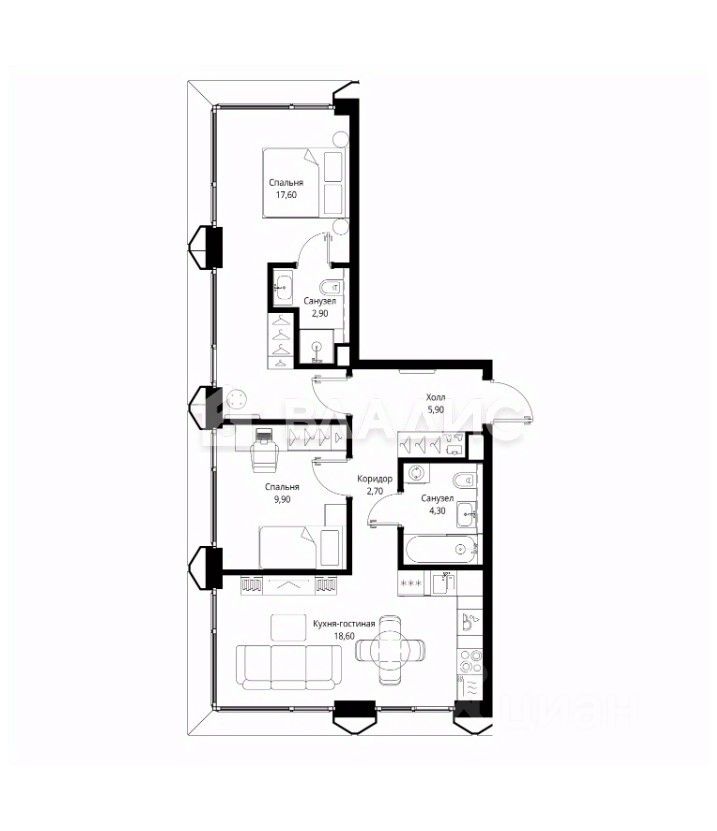 Площадь: 61,9 м²