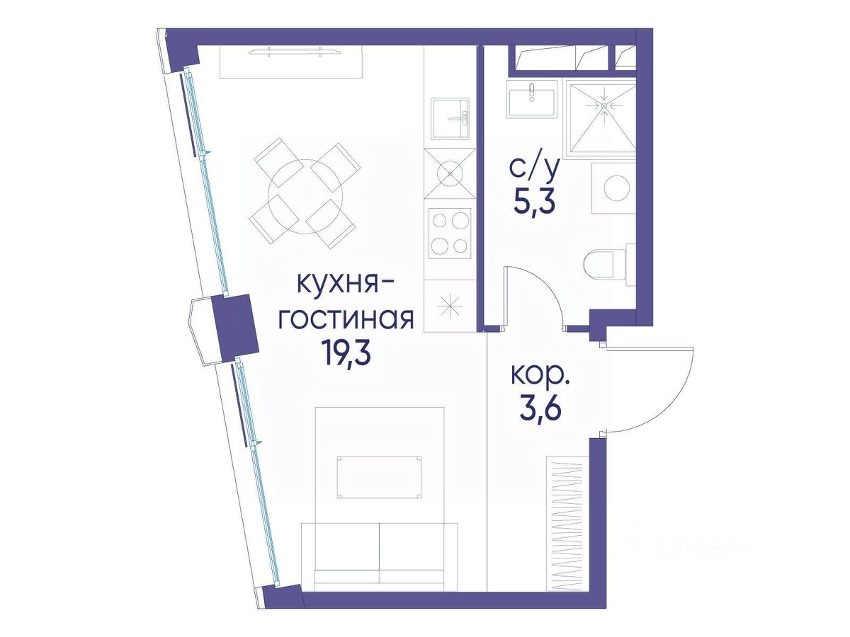 . В жилой зоне 2 больших окна на одну сторону, хорошая инсоляция.