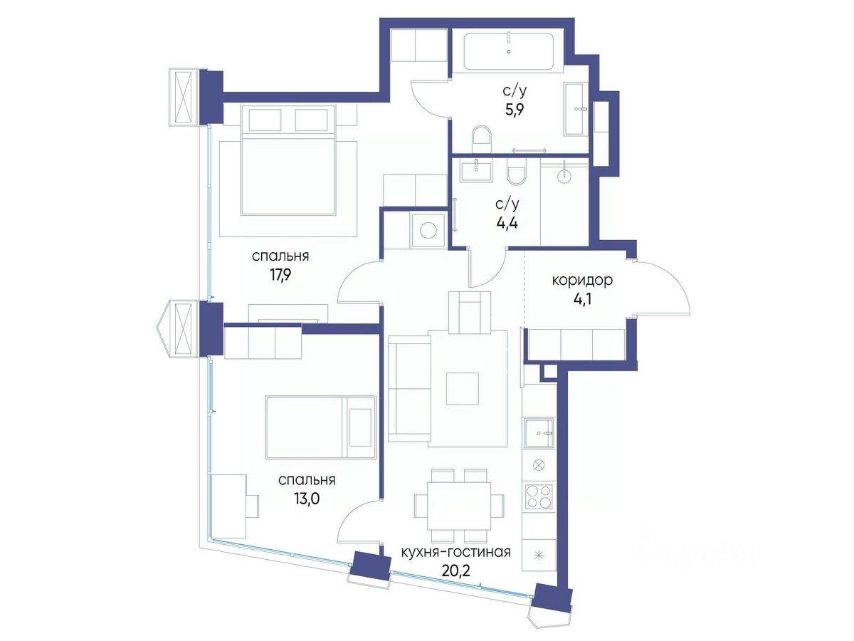 Продаётся двухкомнатная квартира от застройщика: общая площадь 65.50 м², жилая м², кухня м², 7, жилой квартал "Остров 12", корпус 3 (12.1 квартал) (секция 1). срок сдачи: 4-кв. 2025.