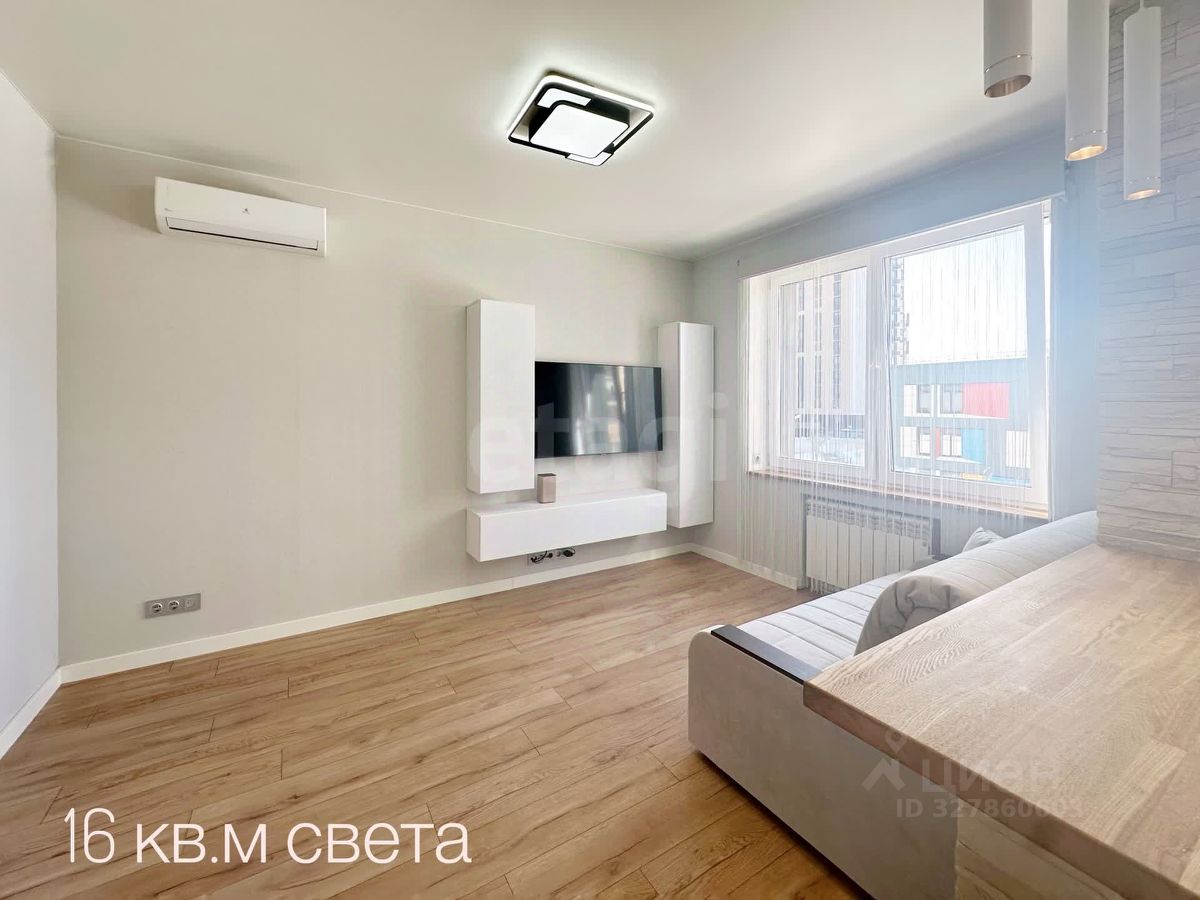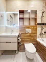 Зонирование кухни-гостиной 8,6кв.м и кабинета 2.4кв.м, рабочий стол и стол/стойка выполнены из маньчжурского ореха. Для комфортного климата установлена сплит система Royal Clima. С прихожей граничит обустроенная гардеробная 3кв.м. Управление свещением через "умный дом" Tuyl через колонку Яндекс Алиса. Ванная комната 4,3кв.м с регулированным полотенесушителем, инсталляций Roca. Тропическим душем и сантехникой AM PM, мебелью для влажных помещений и зеркалом с функцикй антазапотевания и подсветкой.