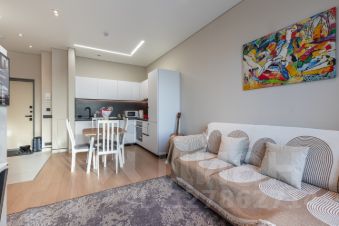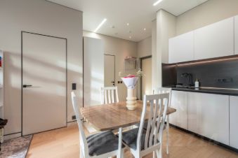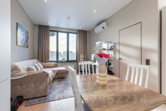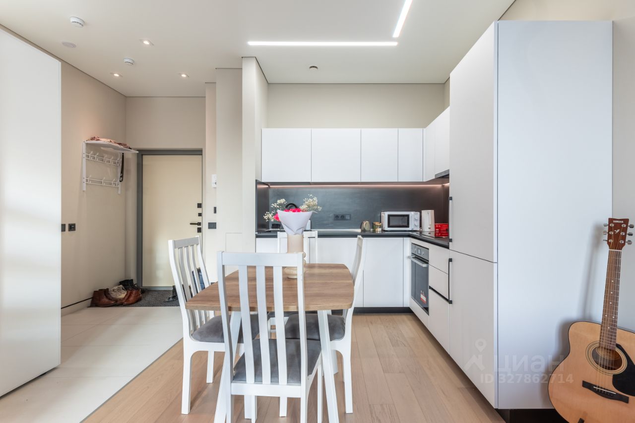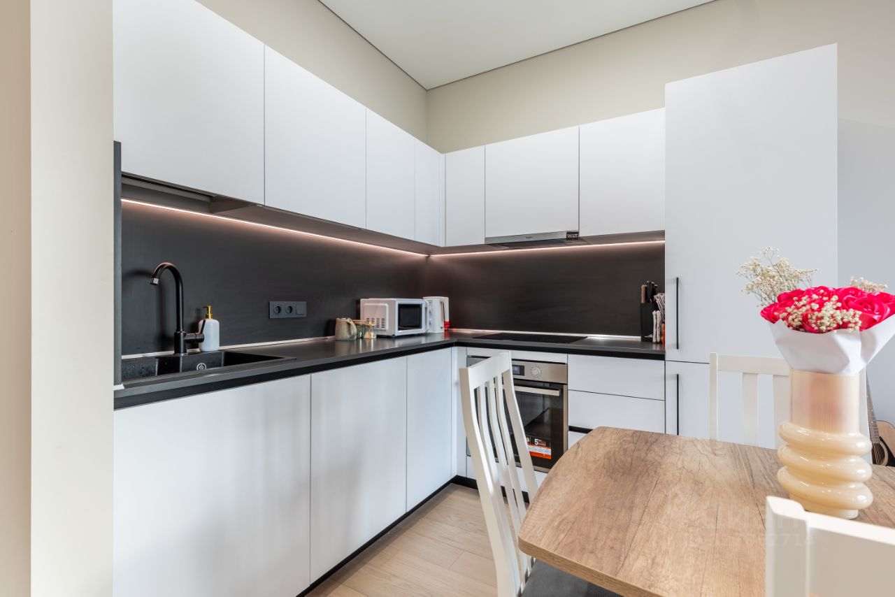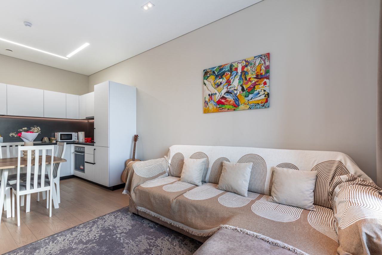 Квартира с продуманной планировкой формата кухня-гостиная: светлое пространство с большими окнами объединяет зону отдыха и обеденную группу. Интерьер выполнен в современном минималистичном стиле — спокойные светлые тона, качественные материалы и аккуратные акценты создают ощущение уюта и простора.