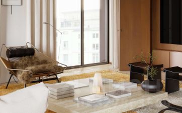Все квартиры в доме передаются с отделкой в эстетике Mid Century. В отделке использованы премиальные натуральные материалы: инженерная доска с уникальным природным рисунком и бережно подобранный натуральный камень. В каждой квартире интеллектуальная система Умный дом, позволяющая дистанционно управлять климатом, освещением, шторами и бытовыми приборами.
