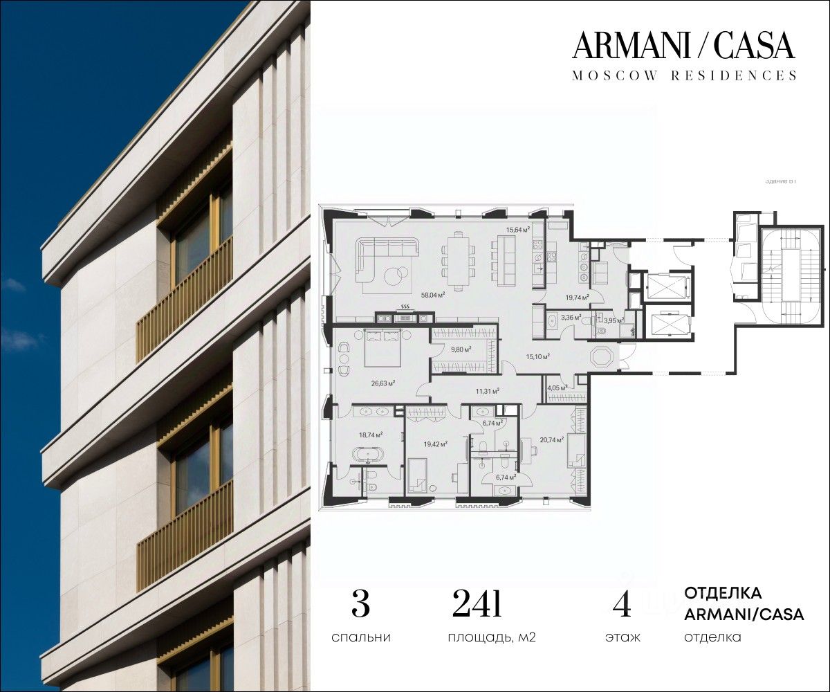 Последние лоты в продаже! КВАРТИРЫ ГОТОВЫ К ПРОЖИВАНИЮ Armani / Casa Moscow Residences — первый и единственный в России проект, созданный в партнерстве с легендарным итальянским домом Armani. Это не просто жилье, а произведение искусства, где каждая деталь отражает безупречный вкус и изысканность итальянского стиля. Комплекс расположился в самом аутентичном историческом районе Москвы — Якиманке. Эта локация известна как "Золотой треугольник искусств": всего в нескольких шагах находятся Третьяковская галерея, Дом культуры ГЭС-2 и новое здание Третьяковки. Всего 26 резиденций в доме создают особую атмосферу приватности и камерности. Это самый камерный проект в Замоскворечье, где каждый житель сможет насладиться тишиной и уютом, вдали от городской суеты. Архитектура создана знаменитым британским бюро John McAslan + Partners. Фасад из натурального камня и элементы из анодированной латуни создают неповторимый облик, гармонично вписывающийся в исторический контекст района. Эксклюзивный дизайн интерьеров от Armani/Casa, премиальные кухни с техникой Gaggenau, сантехника Armani/Roca, инженерная доска из дуба, итальянский мрамор в отделке и дровяные камины с порталами из мрамора создают атмосферу истинной роскоши. Комплекс оснащен всем необходимым для роскошной жизни: фитнес-центр с оборудованием Technogym, спа-зона с хаммамом, детская игровая комната, собственная кофейня и винный бутик, подземный паркинг с прямым доступом к лифтам. Профессиональное управление комплексом обеспечивает безупречный сервис на высшем уровне. Отдельные сервисные лифты для персонала гарантируют комфортное разделение потоков движения. Круглосуточный консьерж-сервис берет на себя все заботы резидентов, обеспечивая максимальный комфорт проживания. Квартиры готовы к переезду! Доступна беспроцентная рассрочка на 1 год
