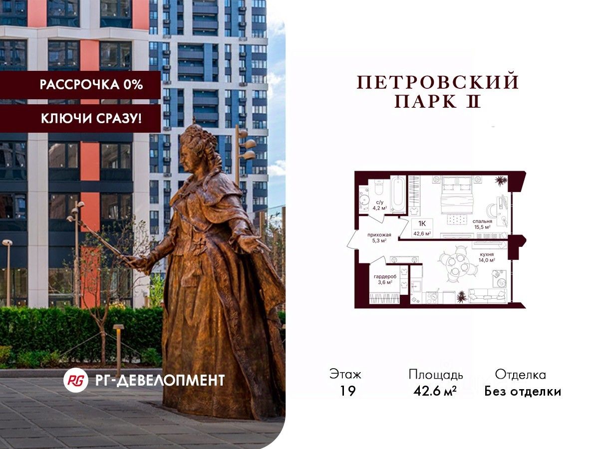 Продаётся 1-комнатная квартира 42.6 кв.м. в ЖК "Петровский парк II" на 19-м этаже 19 этажного дома.