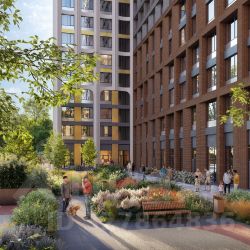 Внутренний двор комплекса - это отдельный мир, закрытый от машин и городского шума. Продуманное благоустройство территорий отсылает к регулярным дворцовым садам: геометрия аллей, зелёные "кабинеты", цветники и камерные зоны отдыха создают разные сценарии для повседневной жизни. Здесь органично соседствуют детские игровые пространства, спортивные зоны и тихие места для отдыха.