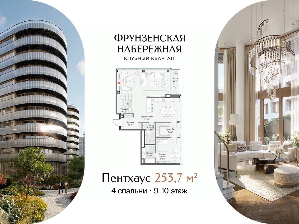 Просторный двухэтажный пентхаус с собственной террасой на крыше. В пентхаусе: • Пять спален • Кухня-гостиная с камином и балконом • Собственная терраса • Потолки 3,67 м Фрунзенская набережная - один из самых желанных районов Москвы, на уровне Остоженки и Патриарших. Поблизости нет и не появится проектов элитного класса: набережная равномерно застроена и клубный квартал завершает формирование этой локации. Масштабная премиальная инфраструктура доступна только резидентам.В большом Clubhouse и на территории парка есть всё для насыщенной жизни вне квартиры: двухэтажный фитнес, многофункциональная спортивная площадка, клубная гостиная и самое большое в элитном классе детское игровое пространство. Клубный квартал "Фрунзенская набережная" - место для приватной и комфортной жизни в окружении людей со схожими ценностями. Здесь тихо, будто за городом: сталинская застройка и высокие сосны укрывают жителей от шума и посторонних глаз. Fine Development - это комплексный, вовлечённый и ответственный подход Sminex. Результат этого - совершенные дома и сервисы: восхищающие, удобные и красивые, с высочайшим уровнем заботы на всех этапах жизни с нами.