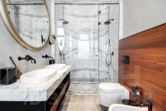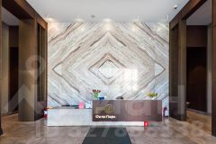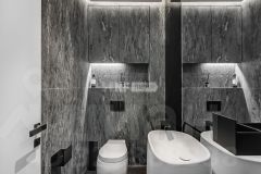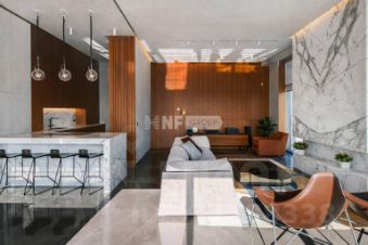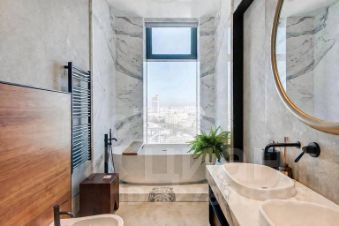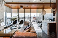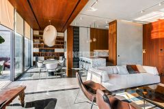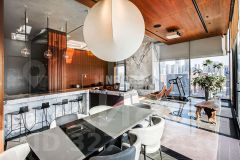 Отделка выполнена по авторскому дизайн-проекту с использованием мрамора Pietra Grey и Iceberg, массива тика, декоративного бетона и кожаных фасадов. Полы — натуральный массив Кумару и мрамор. В пространстве реализована система "умный дом" KNX, установлены розетки и выключатели Ekinex. Мебель и свет подобраны от ведущих мировых брендов — Baxter, B&B Italia, Minotti, Cattelan Italia, Flos, Poliform; кухня и стеллажи изготовлены на заказ. Ванные комнаты оснащены сантехникой Antonio Lupi, Agape и Zender. Из просторной гостиной-кухни предусмотрен выход на террасу с мебелью B&B Italia Outdoor. Интерьер дополняют картины Victoria Rs и декоративные объекты Bagong Ball Gallery, 01001011 Studio, Flinstone Bali, Poltrona Frau. Пентхаус полностью меблирован, оборудован системой кондиционирования, вентиляции и тёплыми полами.
