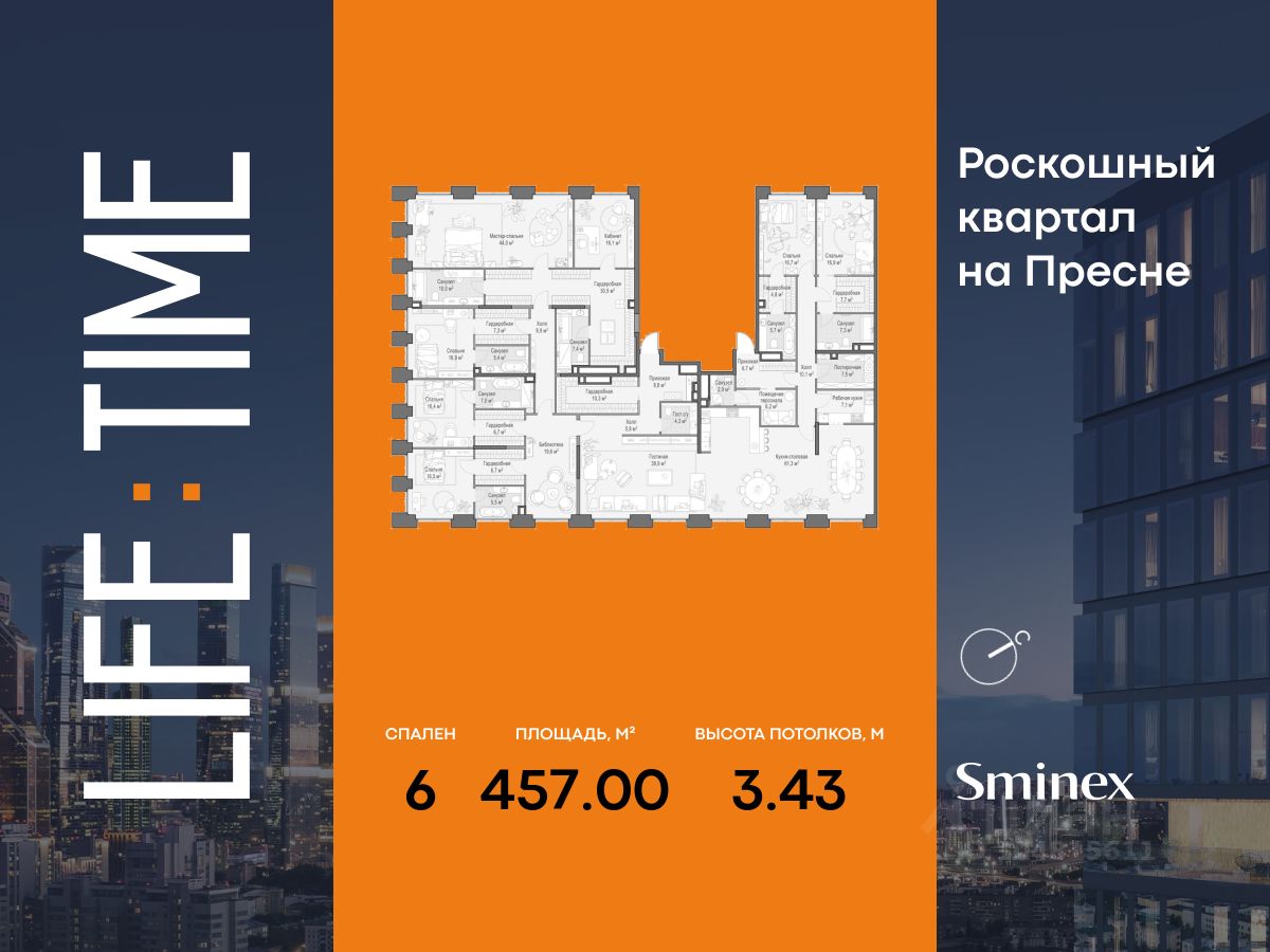 Life Time - роскошный современный квартал на Пресне, в наиболее быстро растущем премиальном районе ЦАО. Его насыщенная инфраструктура и выгодное расположение дарят время для жизни. Вы больше не тратите его на дорогу или ожидание, при этом ни в чём себе не отказывая. На территории предусмотрено всё для комфортной жизни: • двор-парк площадью 1,8 гектара с прудом и фонтанами; • Clubhouse - инфраструктурный центр в отдельном здании с исчерпывающими возможностями для спорта, отдыха и досуга только для жителей; • спортивная инфраструктура на улице и в помещении, в том числе бассейн длиной 25 метров, хот-таб, хаммам, сауна, бьюти-зона; • клубная гостиная с террасой; • всё для развития и досуга детей любого возраста, в том числе детский сад и школа. Life Time находится в центре сложившегося премиального района, в окружении многочисленных парков. Удобная транспортная доступность и прямой выезд на Звенигородское шоссе позволяют без проблем добраться до Садового кольца и Москва-Сити. Архитектурный стиль квартала - роскошный минимализм. Дома десятилетиями будут выглядеть современно. В Life Time представлен широкий выбор как квартир, так и особых форматов: двухэтажные пентхаусы с каминами и террасами, скай-виллы.