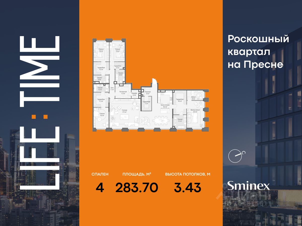 Life Time - роскошный современный квартал на Пресне, в наиболее быстро растущем премиальном районе ЦАО. Его насыщенная инфраструктура и выгодное расположение дарят время для жизни. Вы больше не тратите его на дорогу или ожидание, при этом ни в чём себе не отказывая. На территории предусмотрено всё для комфортной жизни: • двор-парк площадью 1,8 гектара с прудом и фонтанами; • Clubhouse - инфраструктурный центр в отдельном здании с исчерпывающими возможностями для спорта, отдыха и досуга только для жителей; • спортивная инфраструктура на улице и в помещении, в том числе бассейн длиной 25 метров, хот-таб, хаммам, сауна, бьюти-зона; • клубная гостиная с террасой; • всё для развития и досуга детей любого возраста, в том числе детский сад и школа. Life Time находится в центре сложившегося премиального района, в окружении многочисленных парков. Удобная транспортная доступность и прямой выезд на Звенигородское шоссе позволяют без проблем добраться до Садового кольца и Москва-Сити. Архитектурный стиль квартала - роскошный минимализм. Дома десятилетиями будут выглядеть современно. В Life Time представлен широкий выбор как квартир, так и особых форматов: двухэтажные пентхаусы с каминами и террасами, скай-виллы.