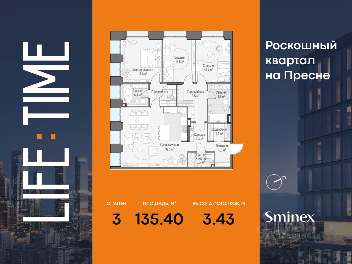 Life Time - роскошный современный квартал на Пресне, в наиболее быстро растущем премиальном районе ЦАО. Его насыщенная инфраструктура и выгодное расположение дарят время для жизни. Вы больше не тратите его на дорогу или ожидание, при этом ни в чём себе не отказывая. На территории предусмотрено всё для комфортной жизни: • двор-парк площадью 1,8 гектара с прудом и фонтанами; • Clubhouse - инфраструктурный центр в отдельном здании с исчерпывающими возможностями для спорта, отдыха и досуга только для жителей; • спортивная инфраструктура на улице и в помещении, в том числе бассейн длиной 25 метров, хот-таб, хаммам, сауна, бьюти-зона; • клубная гостиная с террасой; • всё для развития и досуга детей любого возраста, в том числе детский сад и школа. Life Time находится в центре сложившегося премиального района, в окружении многочисленных парков. Удобная транспортная доступность и прямой выезд на Звенигородское шоссе позволяют без проблем добраться до Садового кольца и Москва-Сити. Архитектурный стиль квартала - роскошный минимализм. Дома десятилетиями будут выглядеть современно. В Life Time представлен широкий выбор как квартир, так и особых форматов: двухэтажные пентхаусы с каминами и террасами, скай-виллы.