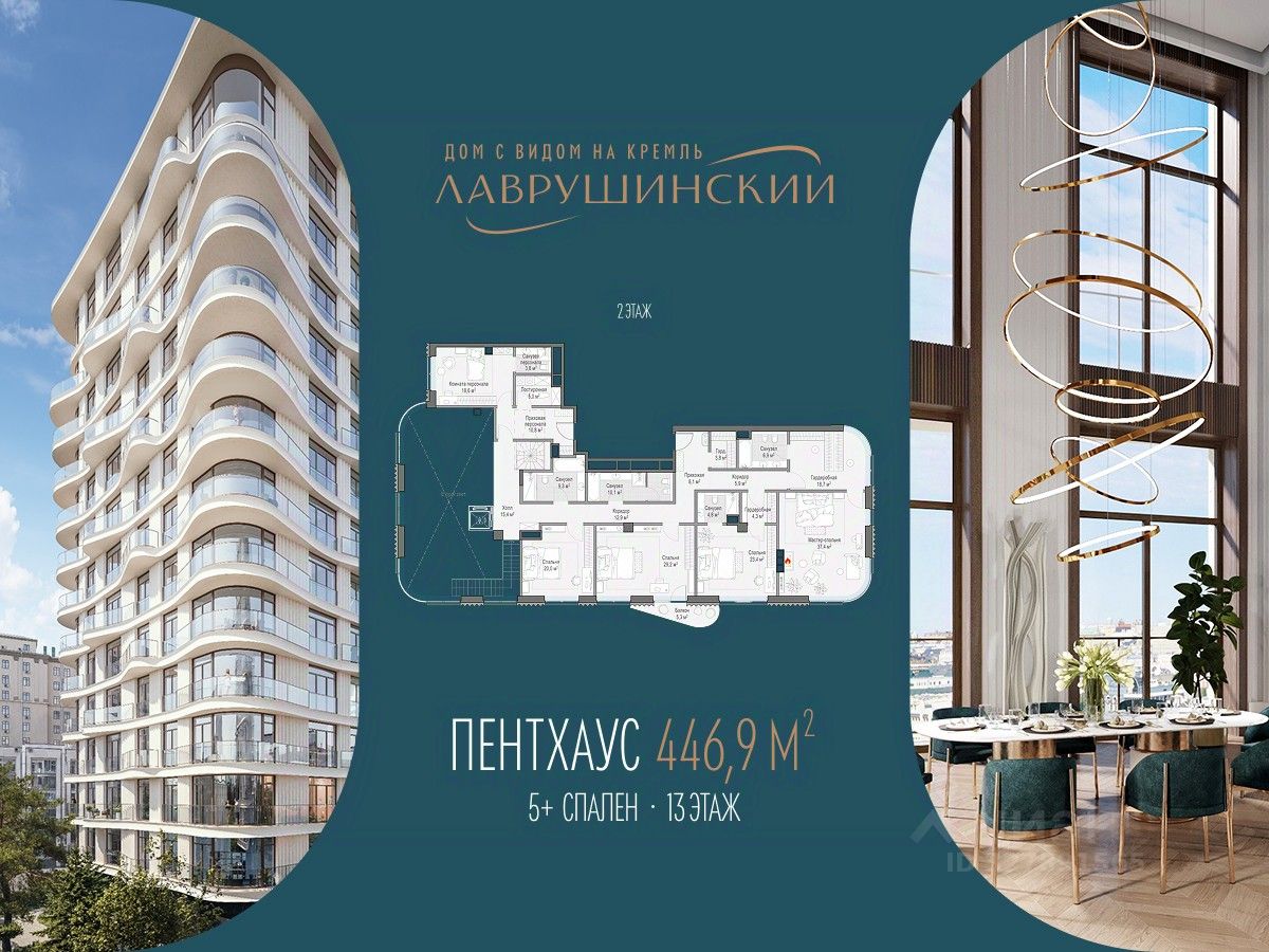 Двухэтажный пентхаус со вторым светом и высотой потолков до 7,9 м, общей площадью 447 м², расположен в восточном корпусе дома "Лаврушинский".