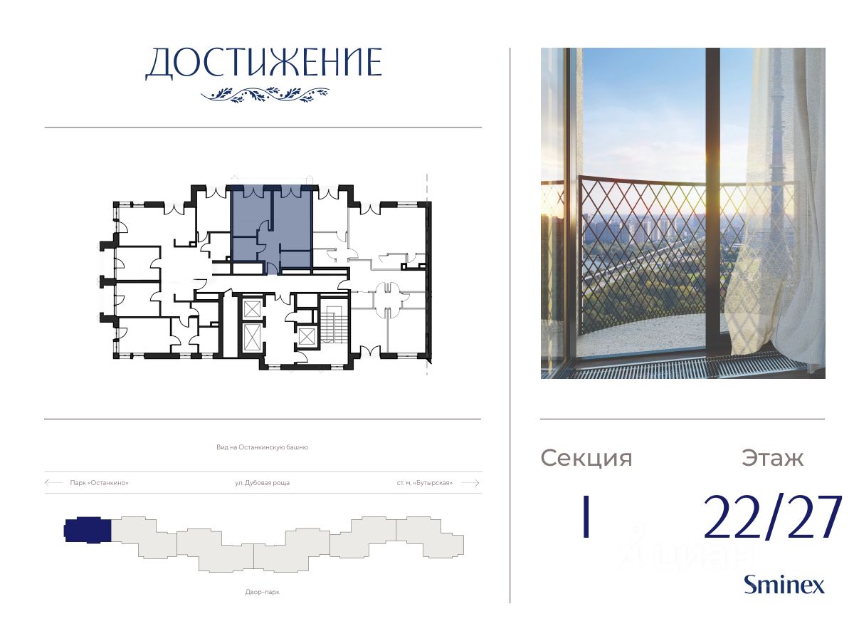 Односпальная квартира с кухней-гостиной, двумя балконами, изолированной спальней и гардеробной 3,8 кв.м. Из окон открывается потрясающий вид на Останкинскую телебашню.