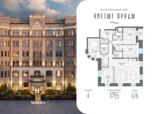 Роскошная квартира площадью 179,5 кв. м. с высотой потолка 3,9 метра. Гостиная с видом на три стороны света и большими окнами дарит пространству много света и воздуха. Из окон открываются виды на итальянский приватный сад и исторические павильоны 19 века. Элегантный сферический эркер добавит кабинету или спальне уюта и изысканности. Спальни размещены на одной стороне квартиры, кабинет и кухня-гостиная - на противоположной, что гарантирует комфорт всем членам семьи, разделив зоны на приватные и общественные.