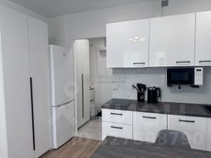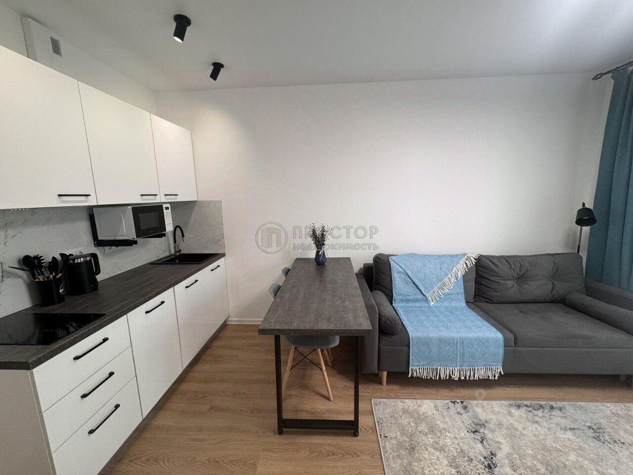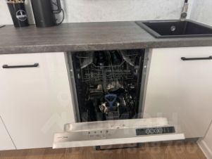Эргономичная кухня со всей необходимой техникой (посудомоечная машина, варочная панель, вытяжка, холодильник). Качественная мебель кухни и спальной зоны, барная стойка-стол изготовлена на заказ. Удобный раскладной диван, шкафы, тумба в прихожей и под ТВ.
