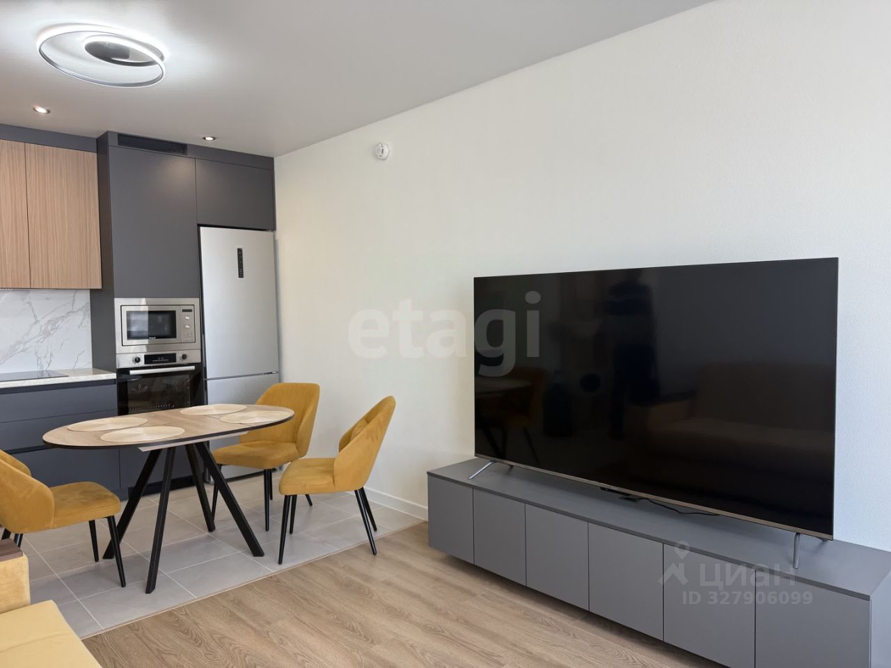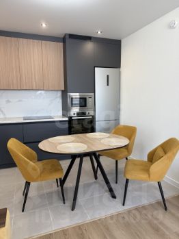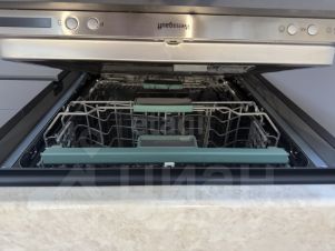 Квартира оборудована мебелью и встраиваемой техникой: индукционная варочная панель, духовой шкаф, микроволновая печь, посудомоечная машина 60 см., вытяжка, стиральная машина с функцией сушки и телевизор 75"