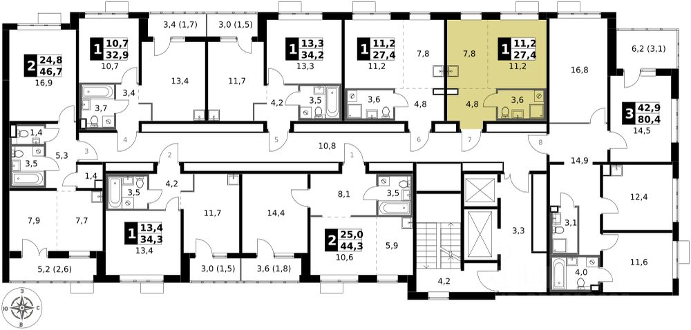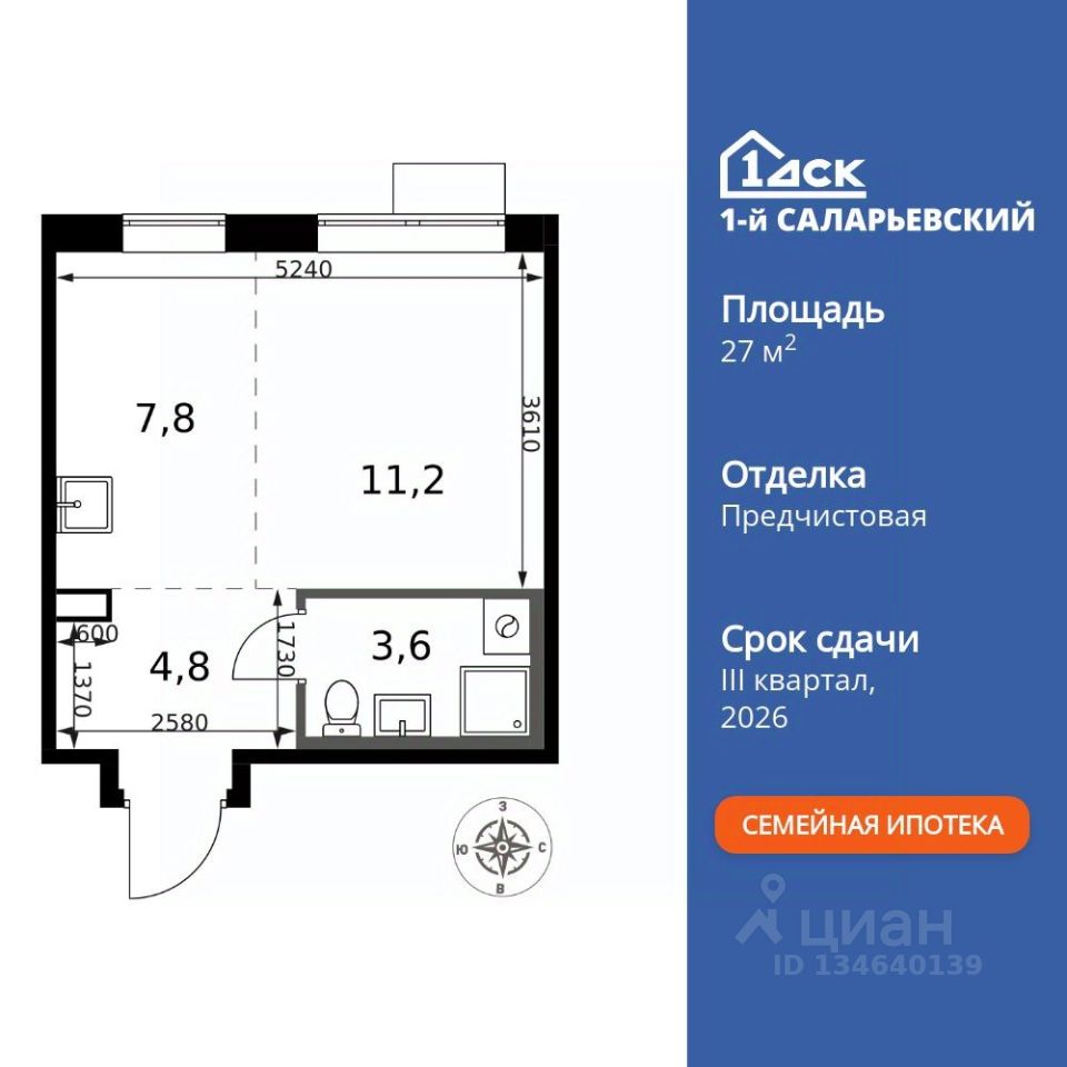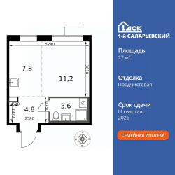 Продаётся квартира-студия номер 256 общей площадью 27.4 кв.м. на 9-м этаже 12 этажного здания. Предчистовая отделка. Цена с учётом скидки.