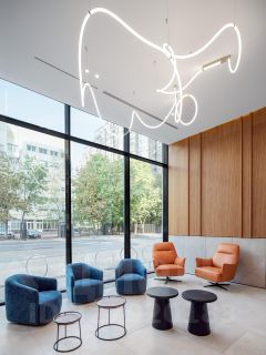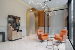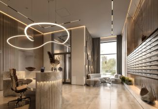 Инфраструктура лобби: зона ожидания, стойка ресепшн, гостевой санузел, лапомойка, колясочная, помещение для хранения посылок.