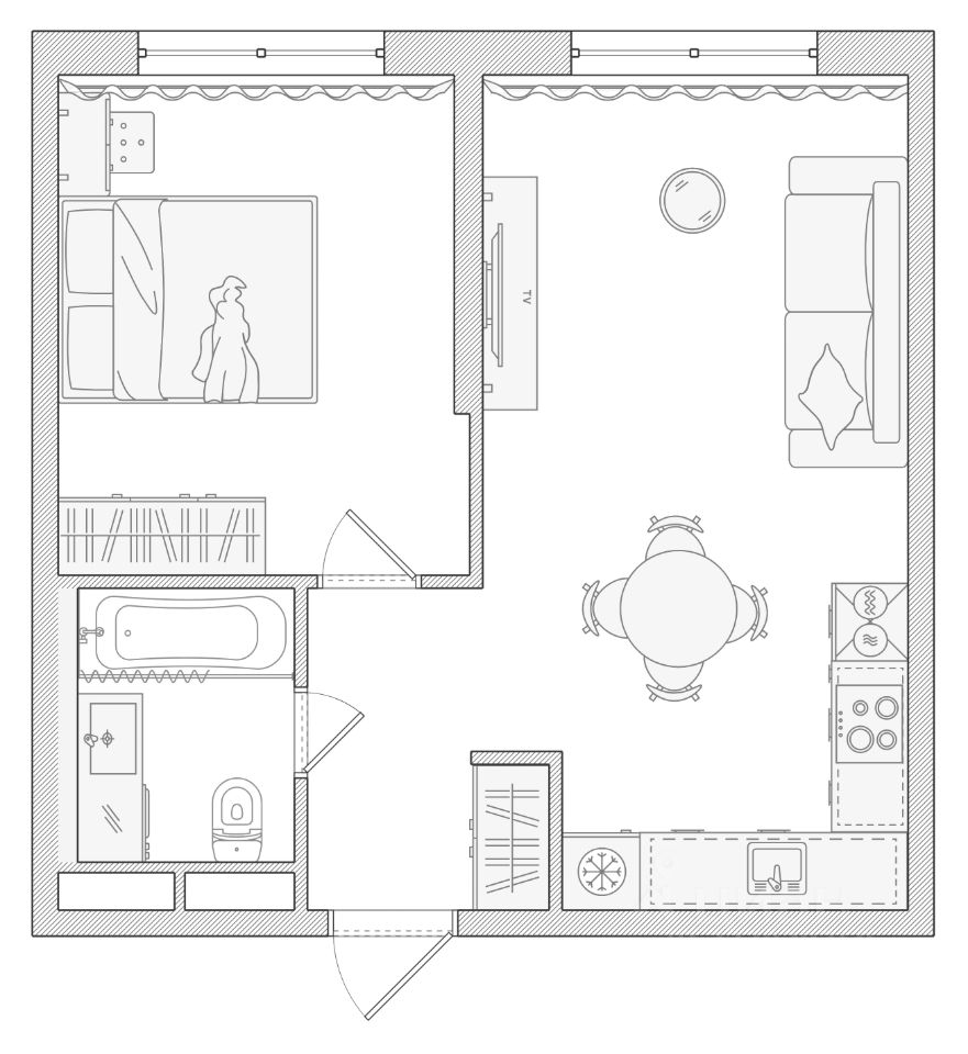 В санузле, на полу уложен серый керамогранит, а на стенах — серая плитка. Ревизионный люк скрыт и отделан под плитку. Завершает интерьер матовый натяжной потолок со встроенными светильниками.
