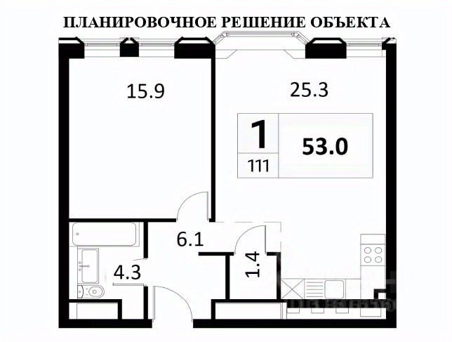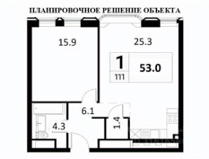 Общая площадь 53 кв. м. Кухня-гостиная - 25,3 кв. м, спальня - 15.9 кв. м, гардеробная комната. санузел 4.3 кв.м.