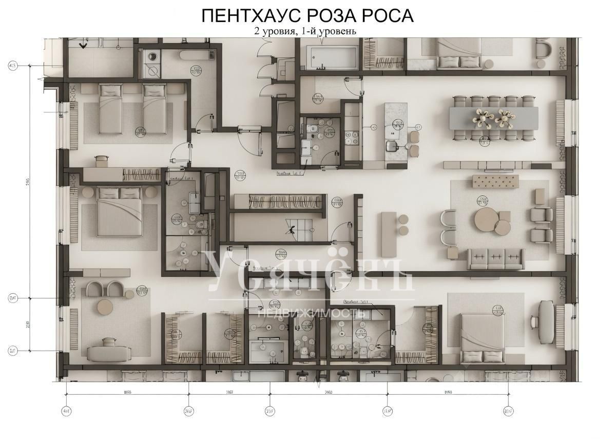Функциональная планировка включает просторную гостиную с зоной кухни-столовой, 4 спальни с собственными санузлами, гардеробные комнаты и постирочную. В апартаментах выполнена предчистовая отделка, что позволяет реализовать индивидуальный дизайн-проект.