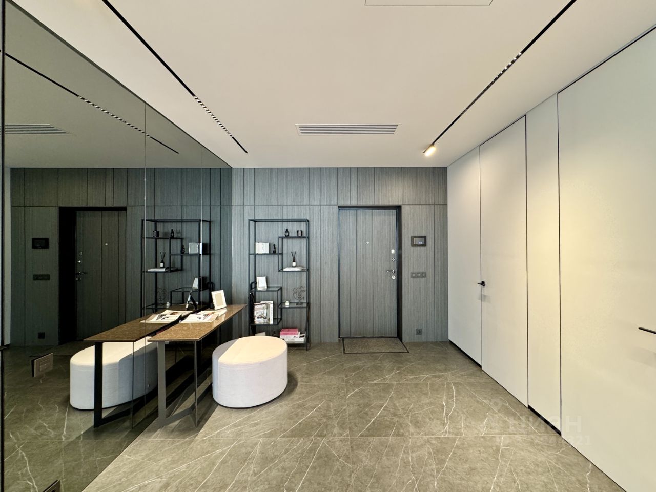 Интерьер выполнен в современном минимализме: натуральный камень, дерево, мягкий свет и утонченная архитектура линий.