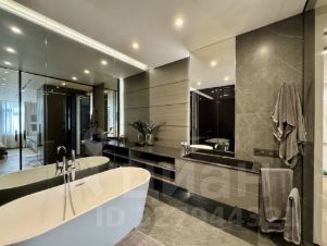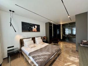 Мастер-спальня — продуманное приватное пространство, включающее ванную комнату с отдельно стоящей ванной и душем, интегрированную в пространство через раздвижные панели.