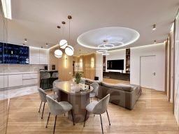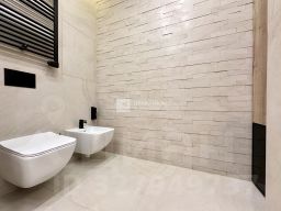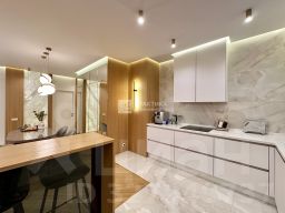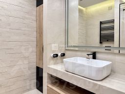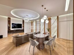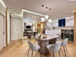 Плита и посудомойка - NEFF. Телевизоры Samsung, Итальянский мрамор, сантехника везде - villeroy & boch. На стенах натуральный шпон дуба. Новые кондиционеры. Тёплый пол на кухне и в двух санузлах. Вся мебель, шкафы, гардероб и т.д. сделаны под заказ.