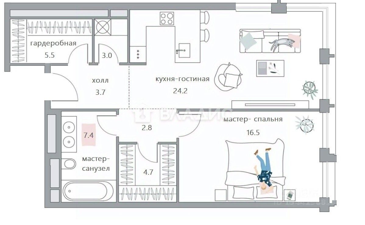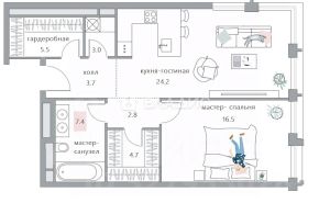 По планировке: светлая кухня-гостиная с дополнительным угловым остеклением 24,2 кв.м., мастер-спальня 16,5 кв.м. c гардеробной и санузлом с ванной и премиальной сантехникой Villeroy & Boch