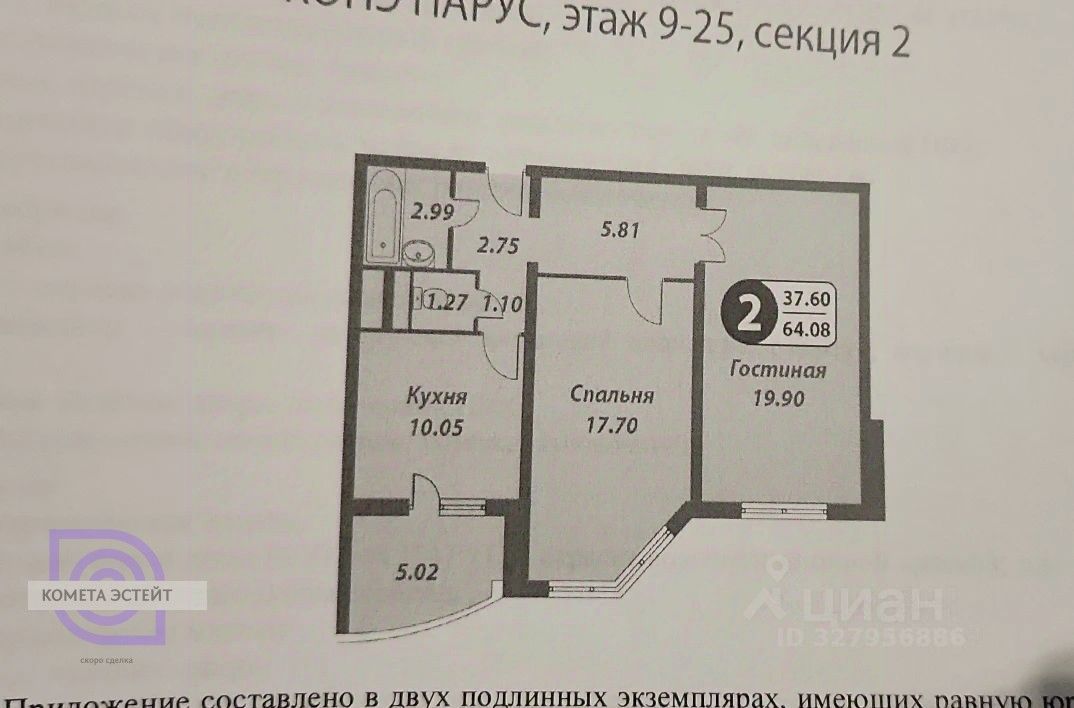 • Площадь: общая — 64,1 кв.м, кухня — 10,1 кв.м.