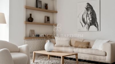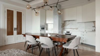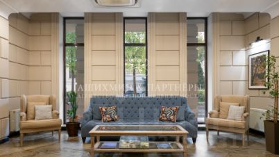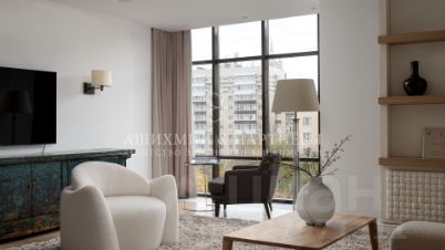 Выполнена безукоризненная отделка натуральными материалами (мрамор, дерево, дубовый паркет, текстиль) по авторскому проекту от именитого дизайнера. Квартира полностью меблирована и декорирована.