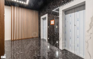 В холле дизайнерская отделка из шпона и колонны с деревянными панелями.