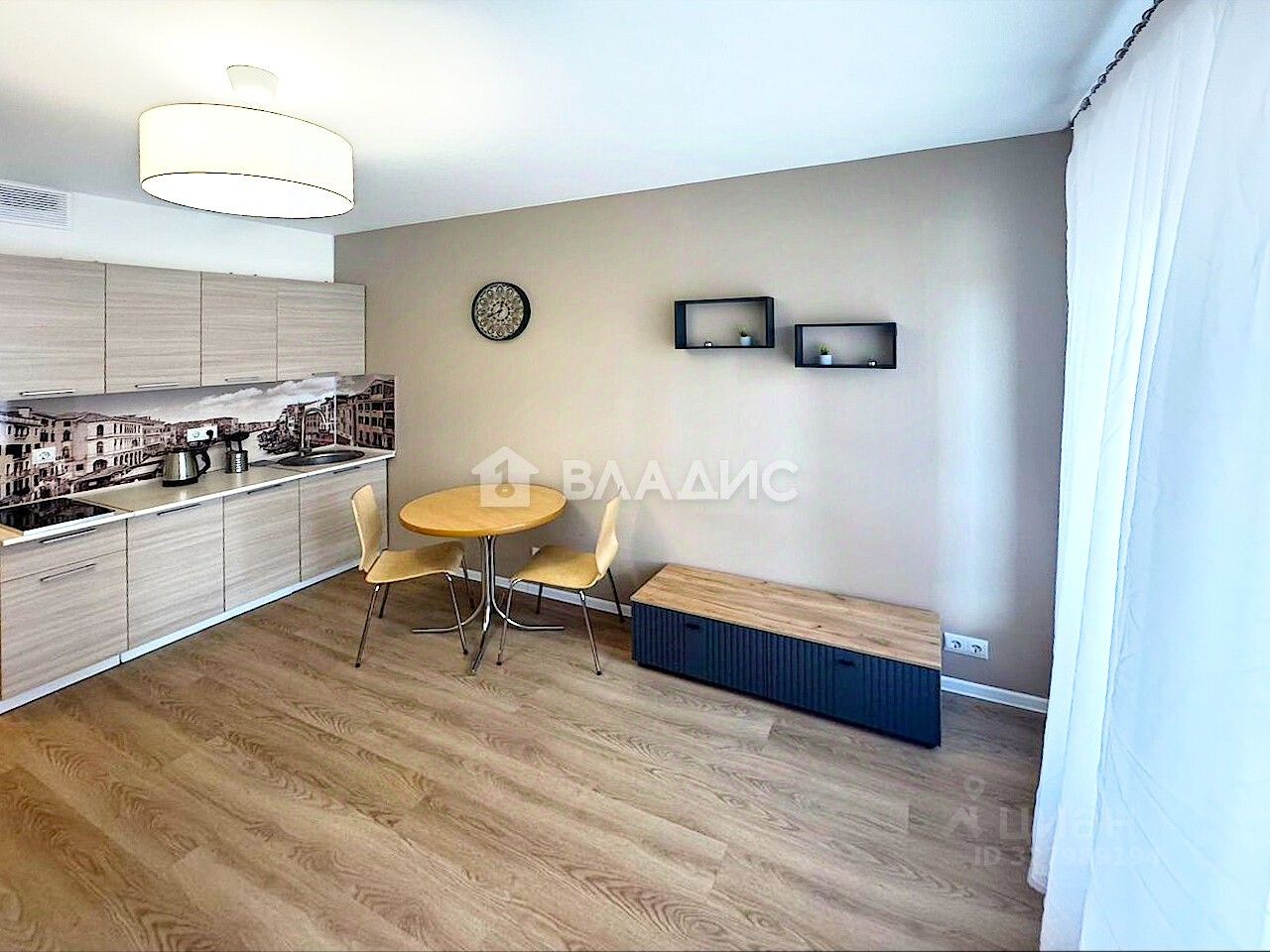 Наполнение: встроенная кухня с техникой и холодильником, большой раскладной двуспальный диван, обденная зона со столом и стульями, комод.