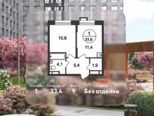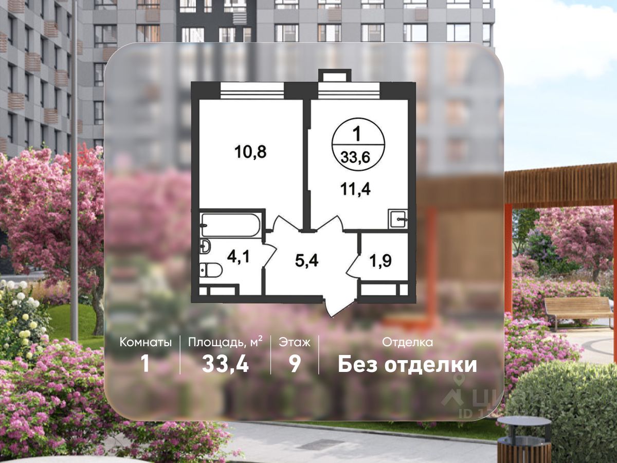 Общая площадь квартиры - 33,4 кв. м, этаж - 9 из 20.