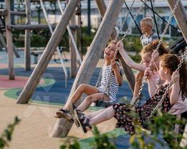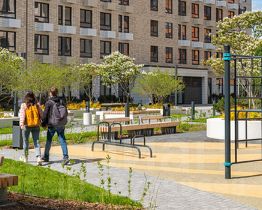 Все корпуса в квартале гармонично сочетаются, образуя единую городскую среду. Между собой их объединяет невысокая этажность и натуральная цветовая гамма. Здесь приятно гулять и проводить время на улице всей семьёй.