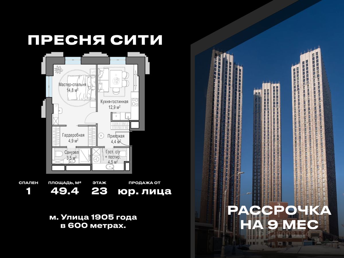Продаётся квартира евро-планировки с одной изолированной спальней, площадью 49,4 кв. м. на 23 этаже в ЖК "Пресня Сити".