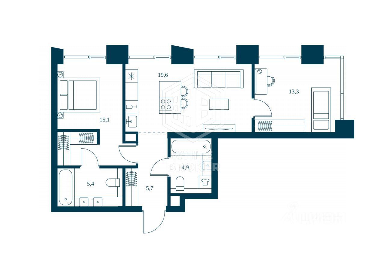 Кухня-гостиная: ~19 м² — просторное светлое пространство для жизни и приёма гостей.
