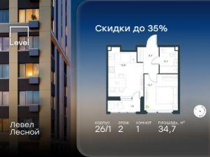 В районе, утопающем в густой зелени лесов, многочисленных парков и скверов, продаётся 1-комнатная квартира площадью 34.70 кв.м с отделкой white box. Квартира расположена на 2 этаже в жилом комплексе комфорт-класса Левел Лесной (компания Level Group/Левел групп).